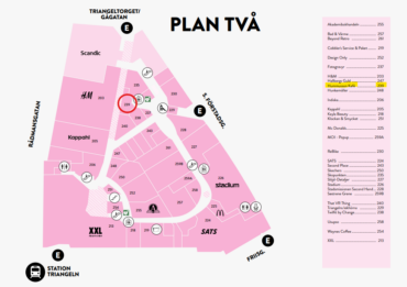 Hummussons café ligger på andra våningen nära lekhörnan (se den rödmarkerade cirkeln på kartan nedan). Närmaste ingång är från Triangeltorget/Gågatan.
